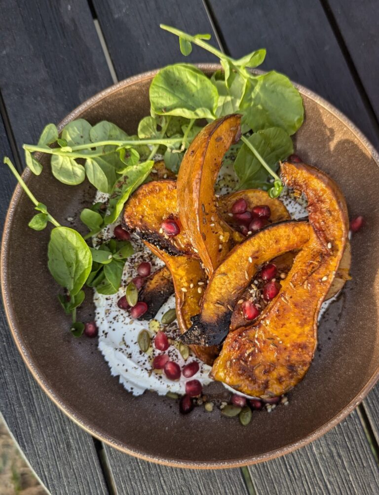 Roasted Squash with Dukkah, Labneh & Pomegranate